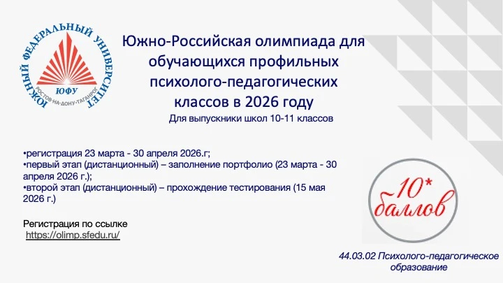 Для участия в Олимпиаде необходимо зарегистрироваться по ссылке: https://olimp.sfedu.ru/