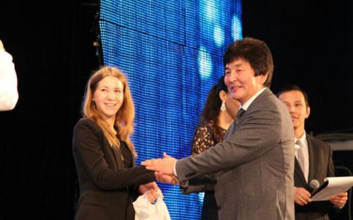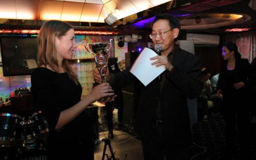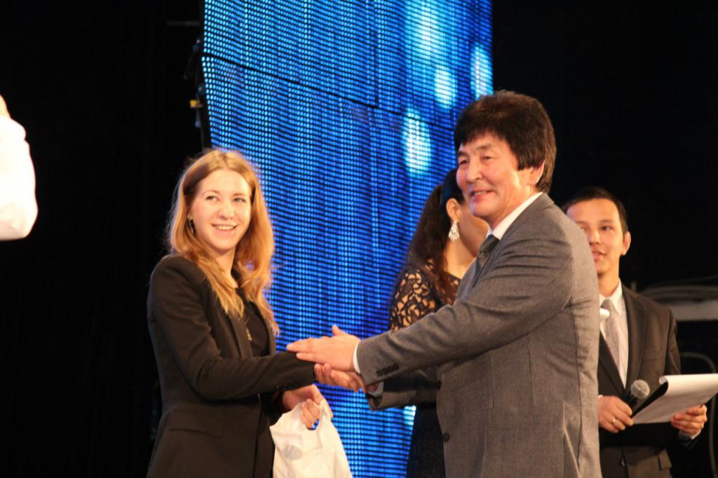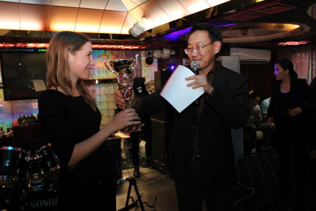Киселева Екатерина получает кубок за первое место в научных дебатах "Science Slam-Fu"